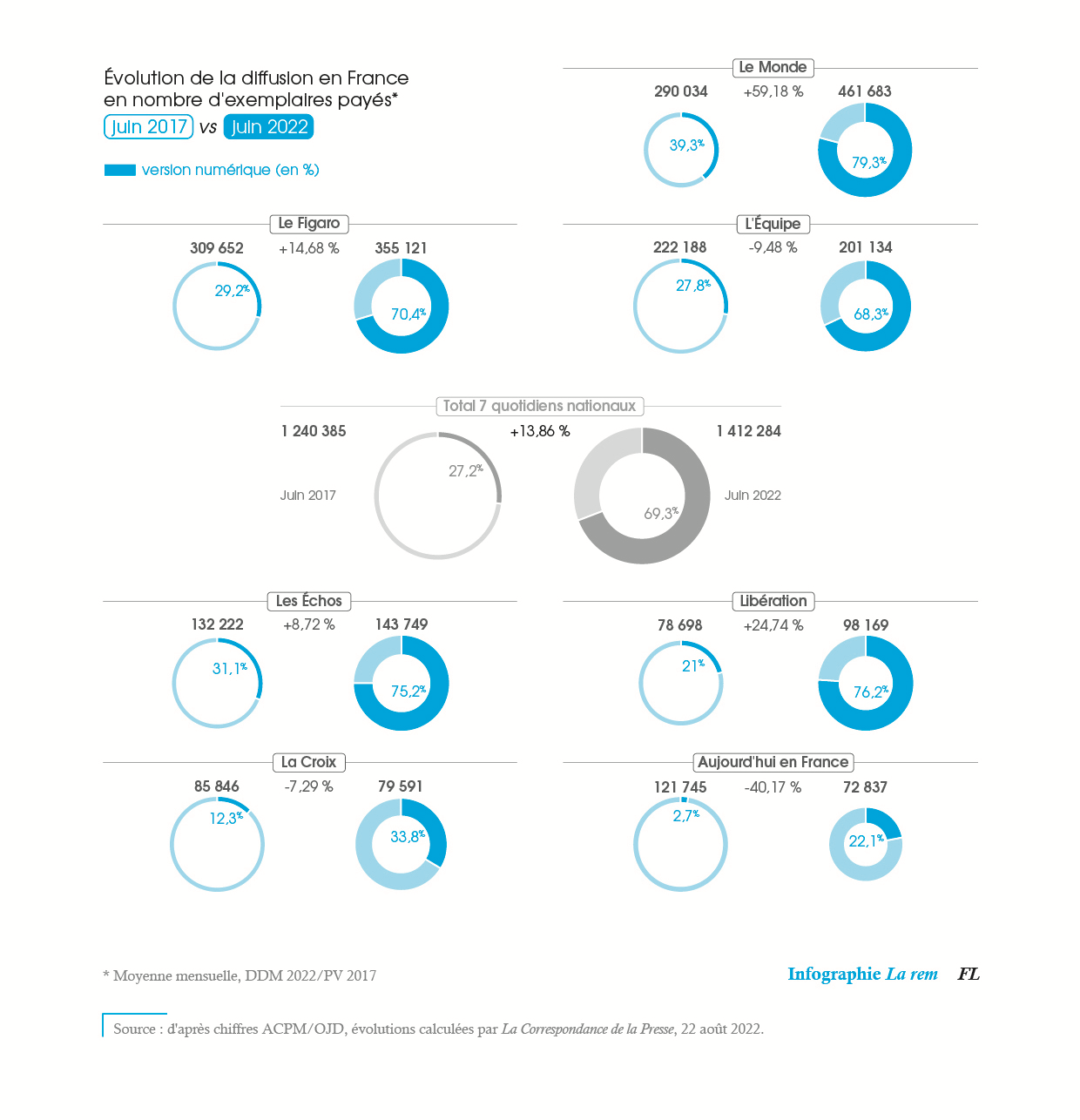 Les versions numériques (exemplaires PDF) représentent 70 % de la diffusion totale payée des quotidiens nationaux en juin 2022, tandis que la vente des exemplaires imprimés décroît. Ce qui contraste avec la presse quotidienne régionale et départementale (51 titres), dont la part des versions numériques s’établissait à 13 % de la diffusion totale payée en 2021.