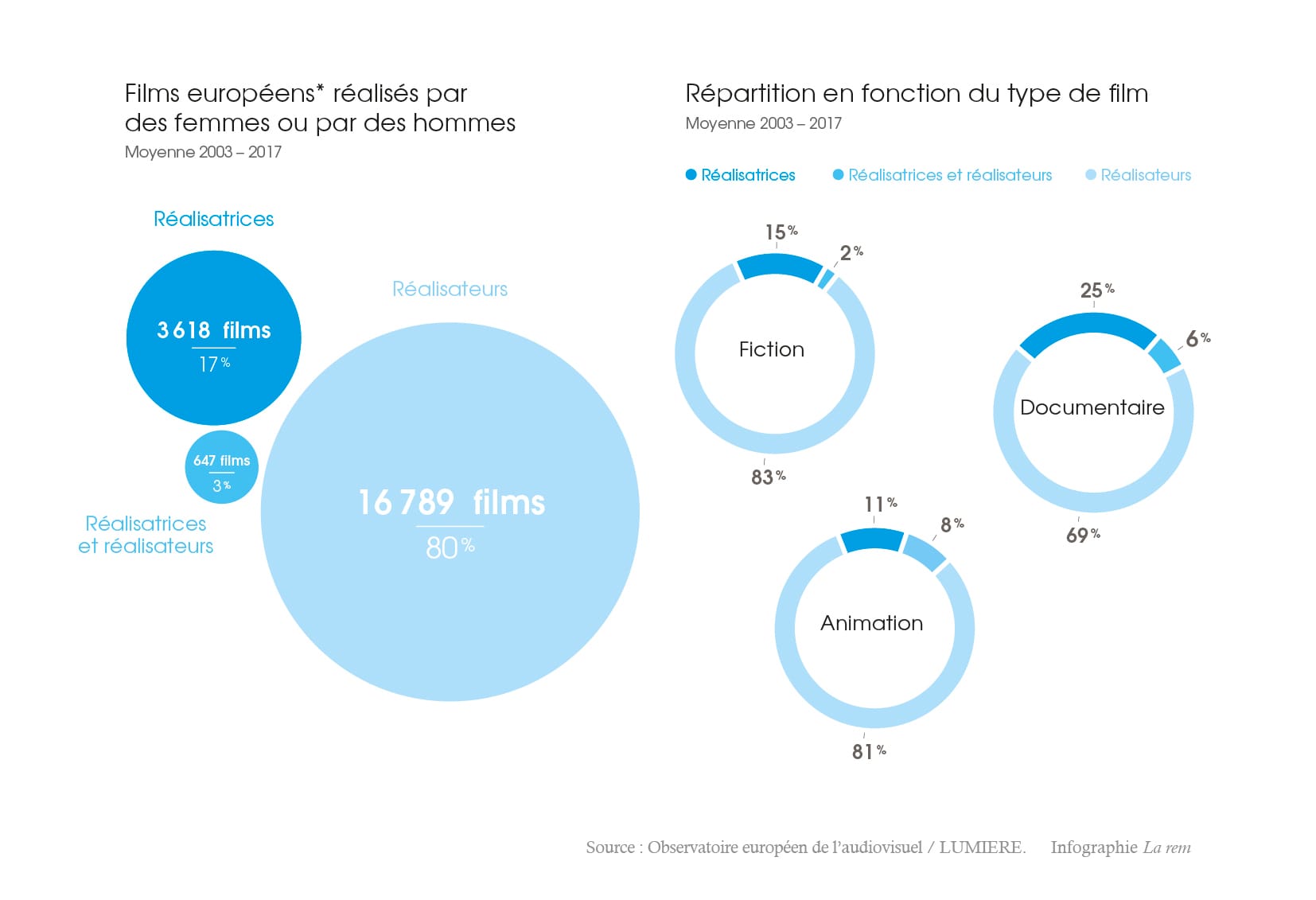 La part des films réalisés par des femmes est modestement passée de 15 % en 2003 à 19 % en 2017. Les femmes réalisent majoritairement des œuvres de fiction – 65 % de leurs longs métrages –, mais cette augmentation, très limitée, est surtout due, selon l’OEA, à la place acquise par les réalisatrices dans la création de documentaires, dont seulement 16 % étaient réalisés par celles-ci en 2003 alors que ce chiffre atteint 42 % en 2017.