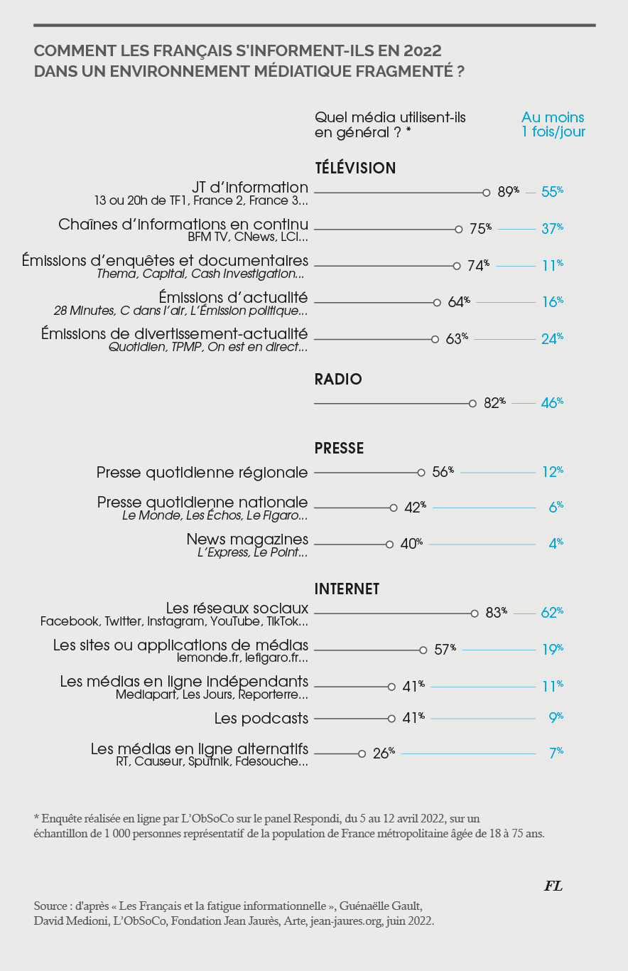 Source : d'après « Les Français et la fatigue informationnelle », Guénaëlle Gault,David Medioni, L’ObSoCo, Fondation Jean Jaurès, Arte, jean-jaures.org, juin 2022.