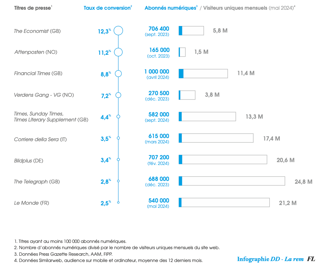 Les éditeurs de presse ayant opté très tôt pour la mise en place d’un mur payant sont ceux qui connaissent le meilleur taux de conversion des visites sur leur site web en abonnements, à l’instar du quotidien américain New York Times qui obtient un taux de conversion de 8,8 % avec 9,9 millions d’abonnés en mars 2024 pour 113 millions de visiteurs uniques par mois. Sur 166 éditeurs dans le monde, le taux de conversion médian était de 0,6 % fin 2022, d’après INMA (International News Media Association), indique le site spécialisé Press Gazette.