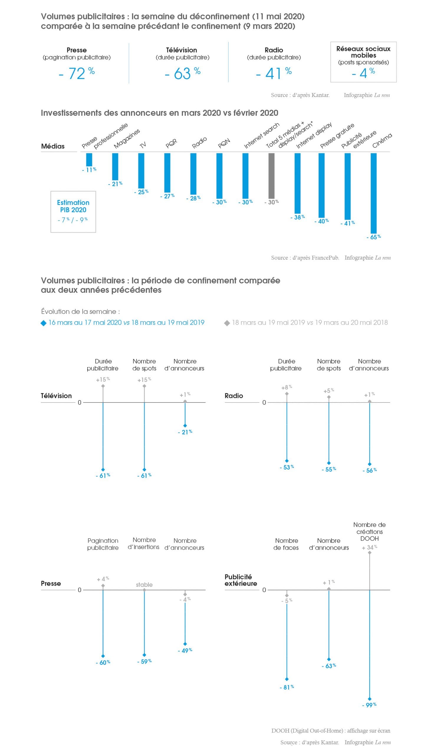 15 mai 2020. - Bilan de l’impact Covid-19 sur le marché publicitaire, de la période de confinement aux premières semaines de déconfinement, Kantar, 28 mai 2020.