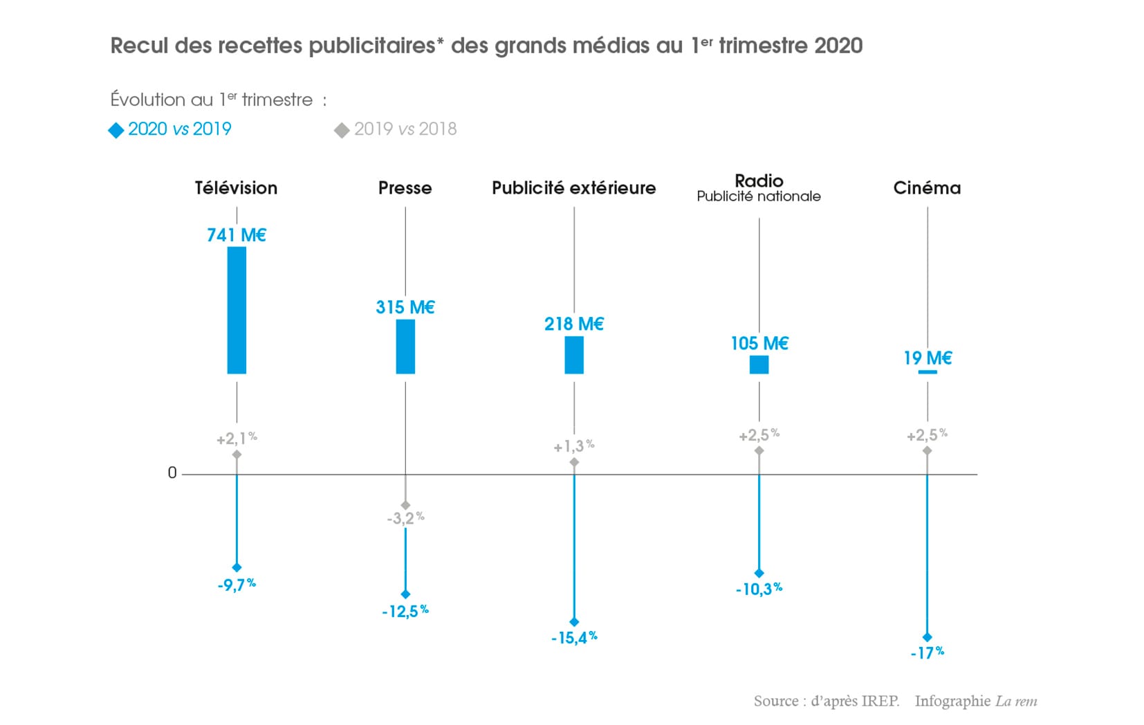 Selon l’IREP (Institut de recherches et d’études publicitaires), le montant des recettes publicitaires nettes* des médias – télévision, cinéma, radio, presse, publicité extérieure, courrier publicitaire, imprimés sans adresse, numérique inclus – est de 1,704 milliard d’euros au premier trimestre 2020, en diminution de - 12,6 % par rapport au premier trimestre 2019 (- 1,3 % T1 2019 vs T1 2018).