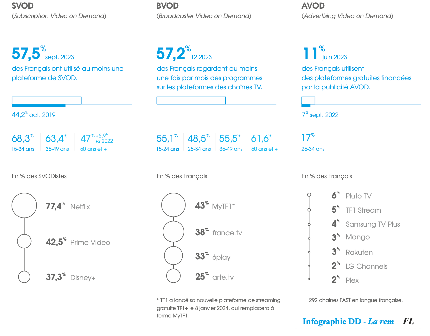 Source : d’après « Observatoire de la vidéo à la demande », Cécile Lacoue, directrice des études, des statistiques et de la prospective, CNC, cnc.fr, 23 janvier 2024.