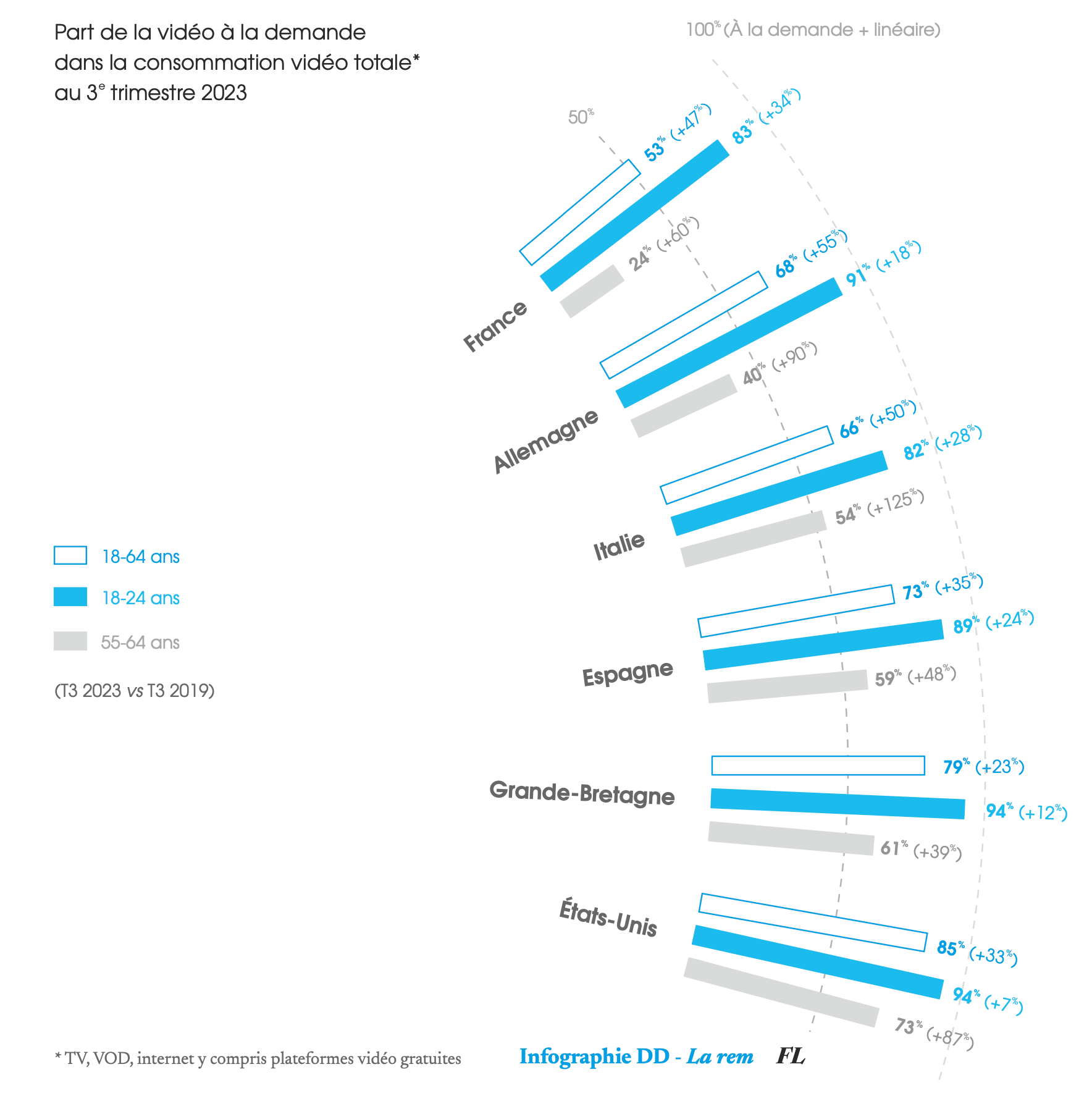 Un cap a été franchi au 3e trimestre 2023 : les Français ont rejoint leurs voisins européens – lesquels ne sont plus qu’un tiers à regarder des films, des séries et autres programmes en mode linéaire, tout comme 15 % seulement des Américains. Fidèles à l’usage traditionnel de la télévision, les Français âgés de 55 à 64 ans font figure d’exception.