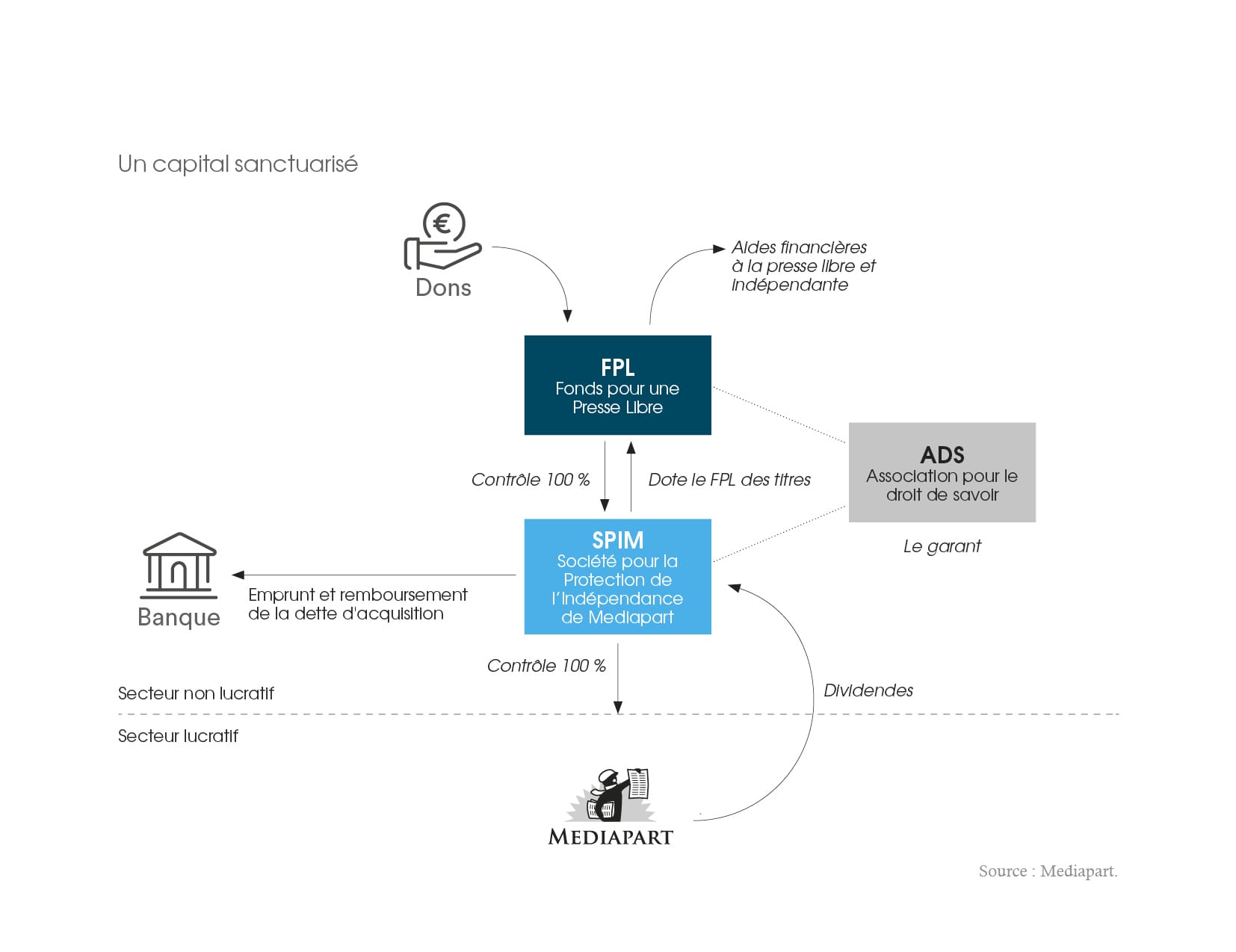 Afin de cloisonner leurs activités respectives, les dirigeants du FPL et de la SPIM sont interdits d’exercer une fonction de direction ou de gestion au sein de Mediapart. De même, les dirigeants de Mediapart ne peuvent diriger ou administrer le FPL ou la SPIM. L’Association pour le droit de savoir (ADS) peut exercer, quant à elle, un droit de veto sur une éventuelle modification des statuts du FPL et de la SPIM.