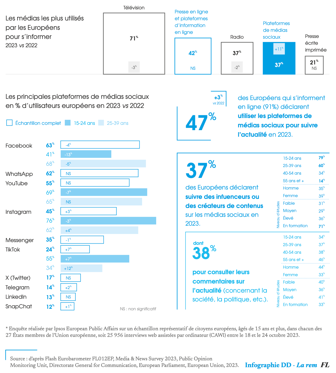 Source : d’après Flash Eurobarometer FL012EP, Media & News Survey 2023, Public Opinion Monitoring Unit, Directorate General for Communication, European Parliament, European Union, 2023.