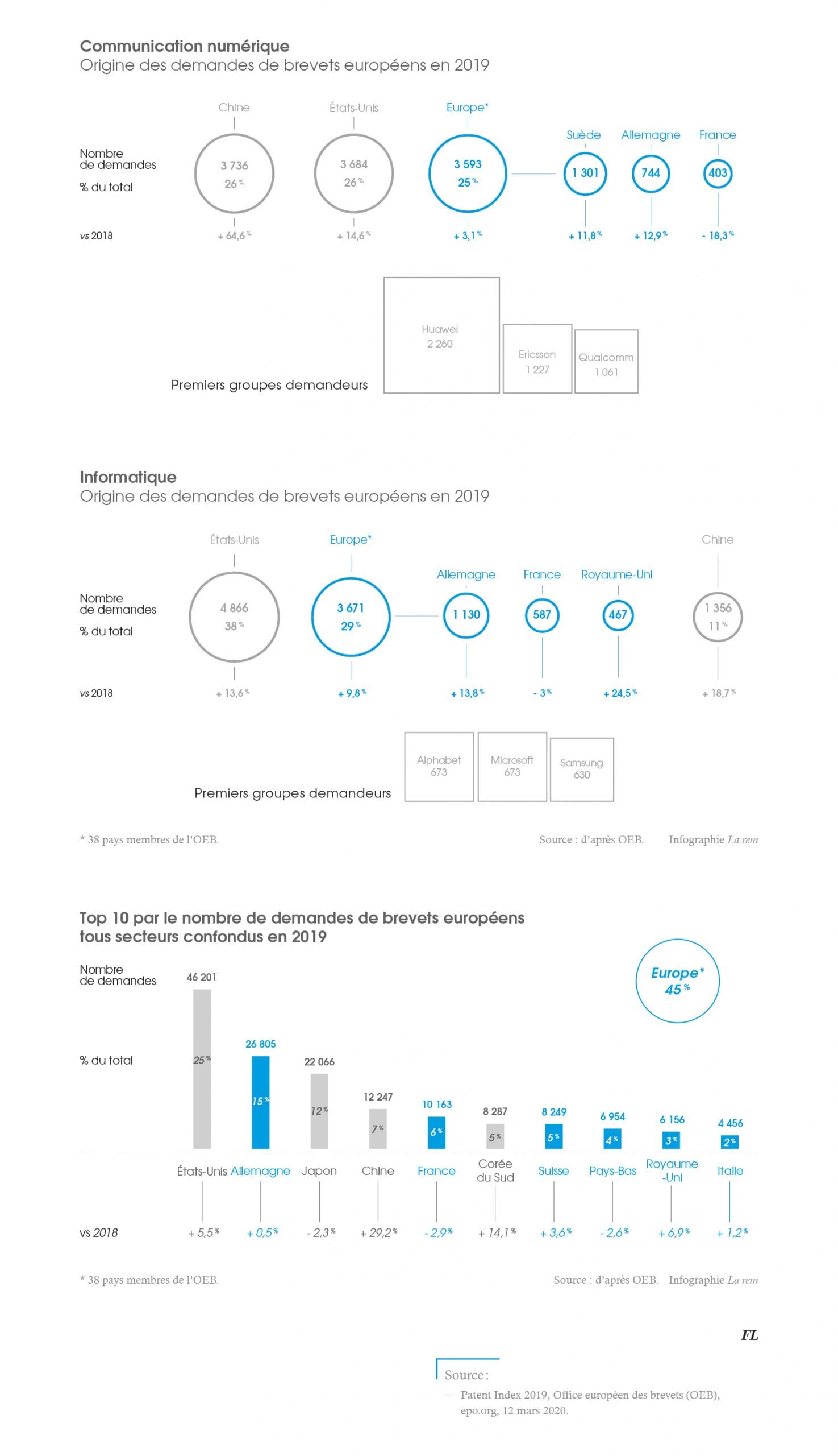 Tous secteurs confondus, trois pays sont à l’origine de la hausse du volume des demandes de brevets européens en 2019 : la Chine, les États-Unis et la Corée du Sud. Passant de 2 061 en 2010 à 12 247 en 2019, le nombre de demandes déposées a été multiplié par six en moins de dix ans. Le groupe chinois Huawei est le premier demandeur de brevets en Europe avec 3 524 demandes en 2019.