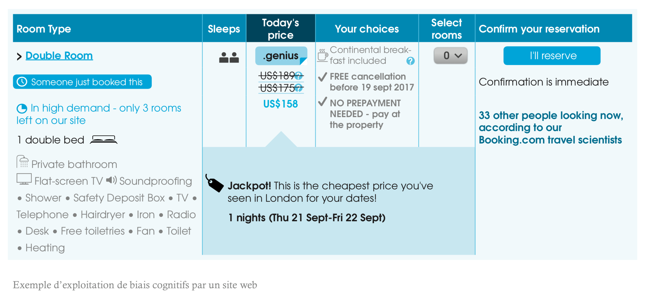 L’exemple suivant illustre comment les biais liés à la « nécessité d’agir rapidement » peuvent être exploités par un site marchand, ici expedia.com. En affichant le message In high demand – We have 1 left (« Très demandé – seulement un seul restant »), le site donne l’impression que le produit est très recherché et risque de ne plus être disponible rapidement. L’utilisateur est alors incité à finaliser son achat, sans trop réfléchir.