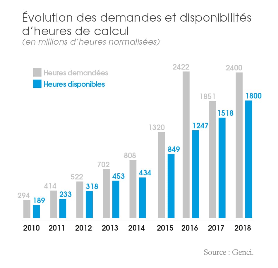 Chaque année, le nombre d’heures demandées augmente plus vite que l’offre en ressource de calcul, ce qui témoigne tout à la fois du dynamisme de la recherche académique ou industrielle française et des mutations des pratiques de l’innovation. En effet, le rapport d’activité de 2018 du Genci explique que « non seulement les entreprises automobiles, pétrolières ou aéronautiques n’envisagent plus de réaliser des crash tests, de mener des campagnes d’explorations, ou de contrôler l’écoulement de l’air sur les ailes d’un avion sans prendre appui sur des simulations numériques, mais les grands groupes et les PME du secteur des nanotechnologies, de la médecine personnalisée ou des énergies renouvelables font désormais appel au calcul intensif ».