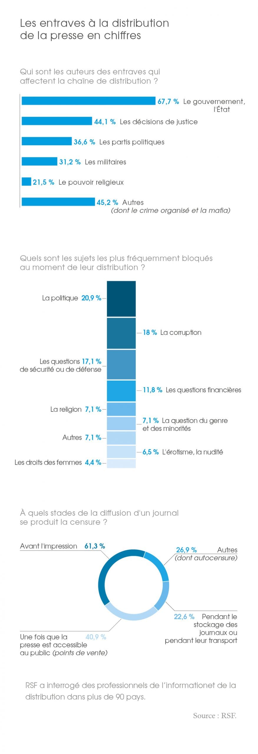 « Tant qu’il n’est pas parvenu dans les mains de son lecteur, un journal reste vulnérable », écrit RSF. Selon son enquête menée auprès des professionnels de l’information et de la distribution de la presse dans 90 pays, les gouvernements ou les États sont désignés, par plus des deux tiers des personnes interrogées, comme les principaux responsables des atteintes à la liberté de la distribution de la presse. Les sujets concernant la politique, la corruption et les questions de sécurité ou de défense figurent parmi ceux qui provoquent le plus couramment des entraves à la distribution. Cette forme de censure intervient le plus souvent avant même que le journal n’existe en tant que tel, avant l’impression, comme en témoignent plus de 60 % des personnes ayant participé à l’enquête. Et selon 41 % d’entre elles, la censure peut également sévir sur les points de vente. Quand ils ne sont pas parvenus à bâillonner les journalistes, les censeurs reportent leurs représailles sur les imprimeurs ou sur les acteurs de la chaîne de distribution. Les moyens employés sont aussi divers qu’efficaces : achat de toute une édition, saisie des exemplaires à l’imprimerie et dans les kiosques, piratage de contenu, instauration d’une taxe douanière rédhibitoire ou organisation d’une pénurie de papier. « Qu’importent la manière et les moyens, l’objectif est toujours le même : empêcher un journal d’être lu », conclut RSF.