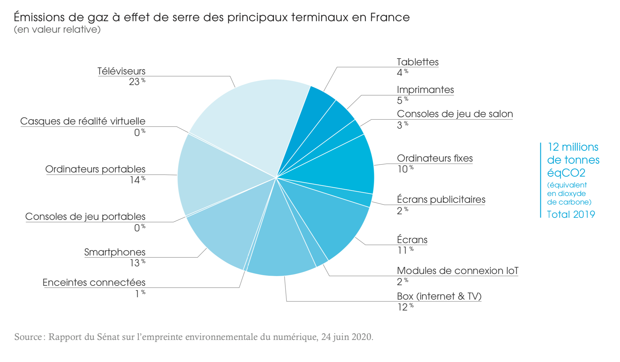 Selon une étude commandée par le Sénat, fournissant des données actualisées pour la France, le transport aérien représente aujourd’hui 4,7 % des émissions de gaz à effet de serre au niveau national alors que le numérique en émet 2 %. En 2040, ce dernier dépassera le premier avec un taux de 6,7 % si aucune régulation n’est mise en place d’ici là. Avec + 60 % d’émissions de tonnes équivalent CO2 (tCO2 eq), la facture pour atteindre la neutralité carbone du secteur numérique passerait à 12 milliards d’euros en 2040, alors qu’elle était de 1 milliard en 2019.