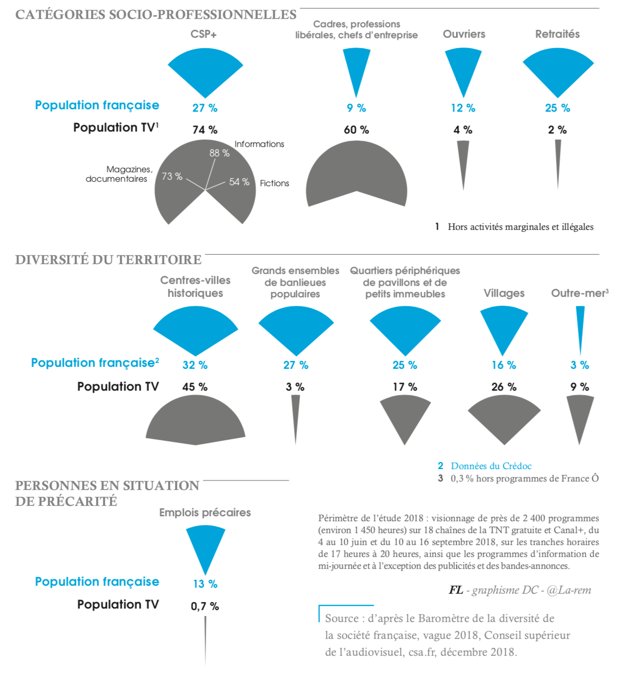 Beaucoup de CSP+ et de centres-villes historiques ; peu de grands ensembles de banlieues populaires et pas de précarité : les chaînes de télévision ne prennent pas le risque de coller au réel. Conçu par le Conseil supérieur de l’audiovisuel, le baromètre 2018 de la représentation de la diversité de la société française montre ce décalage à travers de nouveaux critères : le lieu de résidence et la précarité.