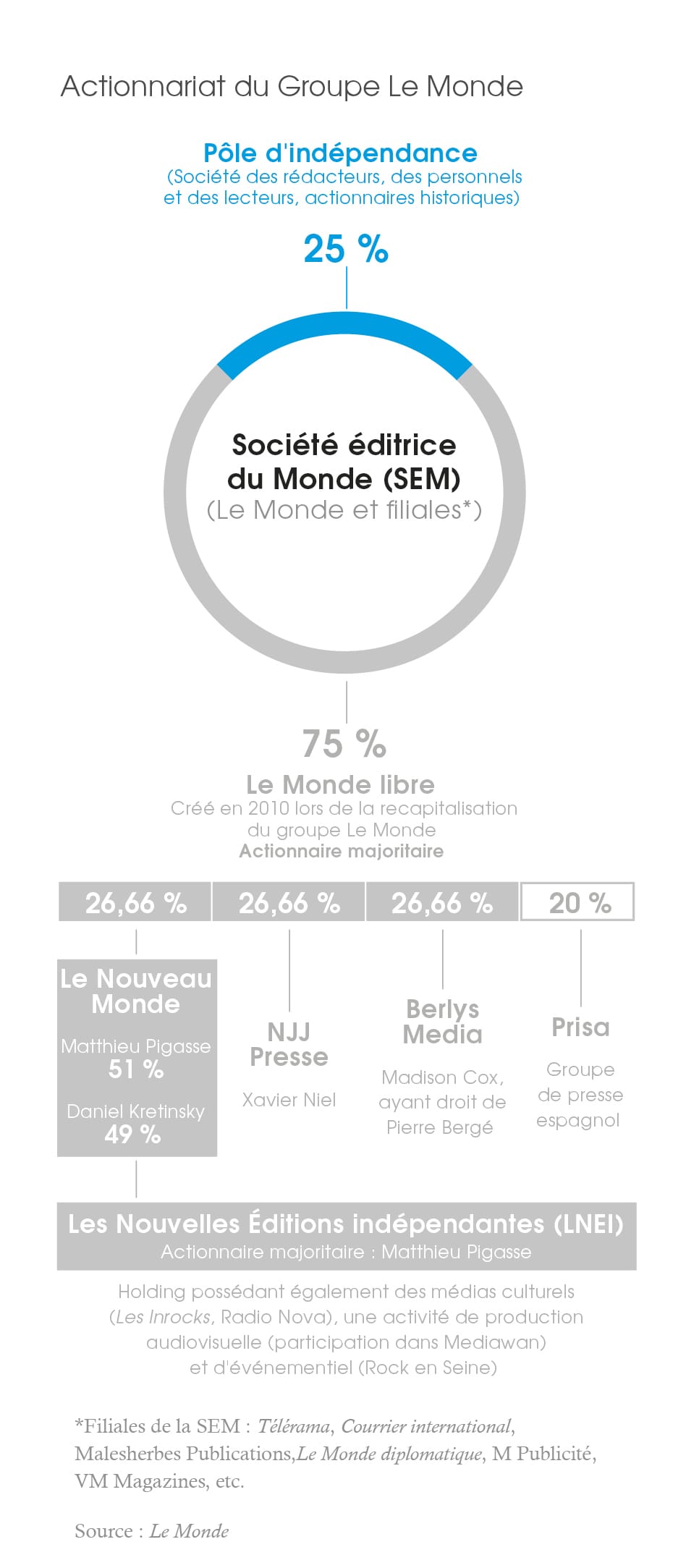 En 2010, la Société des rédacteurs du Monde donnait le contrôle du quotidien au trio Bergé-Niel-Pigasse (BNP) et, grâce à son droit de veto, dissuadait l’espagnol Prisa de tenter une prise de contrôle (voir La rem n°17, p.63). Pourtant, Prisa était au capital du titre depuis 2005 et apportait avec lui l’expérience d’un grand groupe de médias, Prisa éditant notamment El País en Espagne. Mais une solution française et atypique a été retenue avec le trio BNP, réuni au sein d’une société en commandite, Le Monde Libre, qui contrôlera 75 % du capital du groupe, le solde étant détenu par le pôle d’indépendance du Monde. Cette société en commandite donne le contrôle du Monde Libre au seul trio BNP, chacun disposant de 26,66 % du capital, le solde, 20 % du capital du Monde Libre, restant détenu par Prisa qui n’a pas de pouvoir décisionnaire.