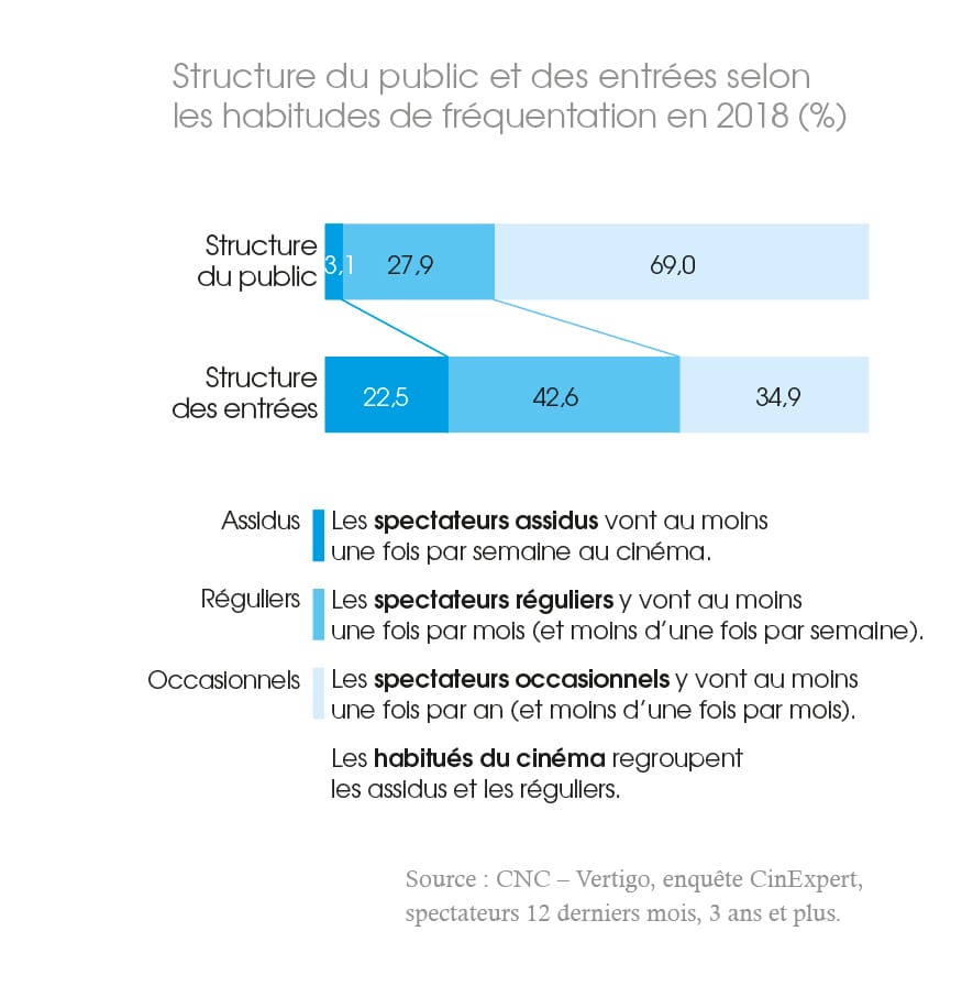 Autre tendance de fond : la part des habitués des salles de cinéma rétrécit progressivement pour représenter 31 % des spectateurs en 2018 contre 38 % en 2015 et, parmi eux, le nombre de spectateurs assidus est passé de 5 % en 2015 à 3 % en 2018 et les spectateurs réguliers de 33 % à 28 %.