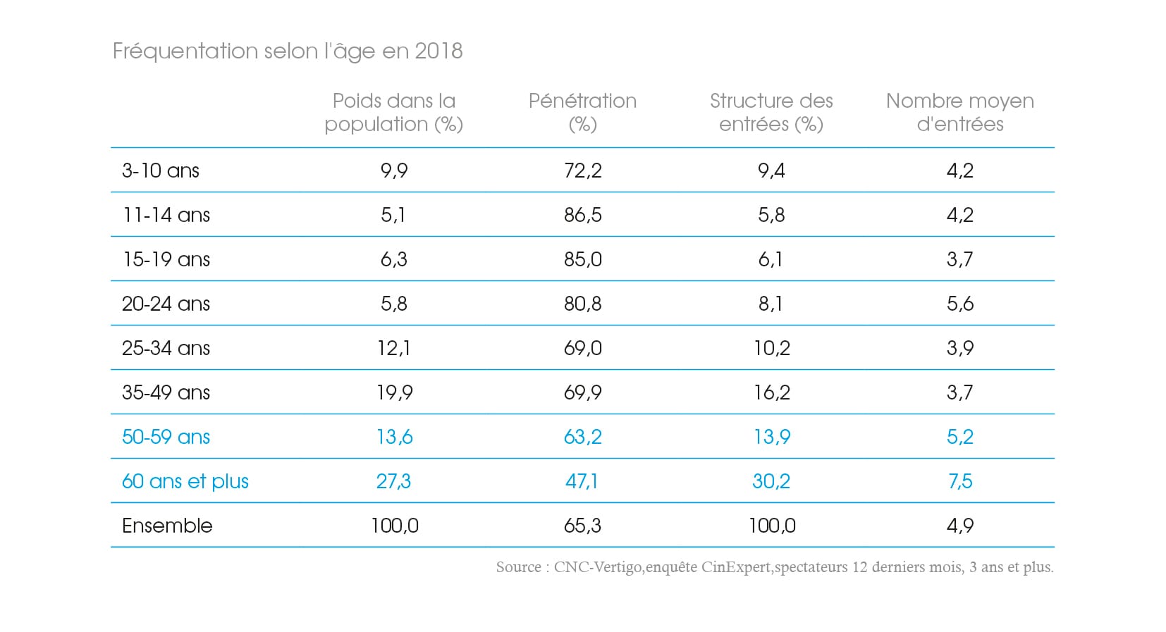 En 2018, les deux tiers des Français âgés de 3 ans et plus (65,3 %) sont allés au moins une fois au cinéma, soit 41 millions de spectateurs, comme l’indique le bilan annuel du CNC (Centre national du cinéma et de l'image animée). Ce public se répartit presque à parts égales selon trois tranches d’âge : 33,1 % de moins de 25 ans ; 34,1 % de 25 à 49 ans et 32,8 % de 50 ans et plus. C’est cette dernière catégorie, les spectateurs âgés de plus de 50 ans, qui réalise la majorité des entrées en salle : 44,1 % en 2018, en augmentation de 7,7 % par rapport à 2017 ; tandis que les moins de 25 ans constituent 29,5 % des entrées, -4,8 % par rapport à 2017, et que les 25-49 ans génèrent 26,5 % des entrées en salle, en baisse également, -2,9 % sur un an.