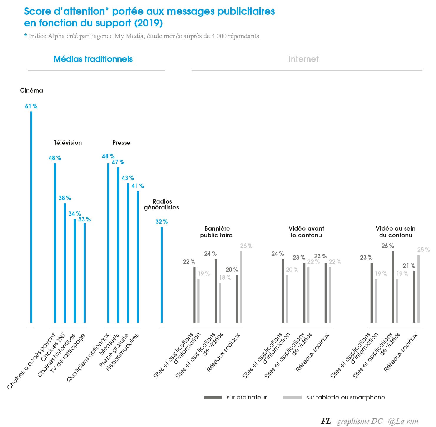 Avec plus de 1 200 expositions publicitaires par jour, l’attention portée par les consommateurs aux messages publicitaires est plus forte sur les médias traditionnels que sur les sites web, applications ou réseaux sociaux. Et pourtant, la part de marché publicitaire de l'internet en ligne ne cesse de croître.