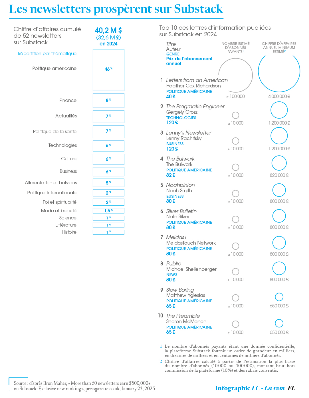 Lancée en 2017, la plateforme américaine d’autoédition Substack permet la diffusion de lettres d’information payantes par courrier électronique. Début 2023, 27 d’entre elles étaient rentables. En 2024, plus de 50 newsletters ont rapporté au moins 500 000 dollars (400 000 livres) de revenus annuels à leur auteur, selon un classement réalisé par le site britannique PressGazette.