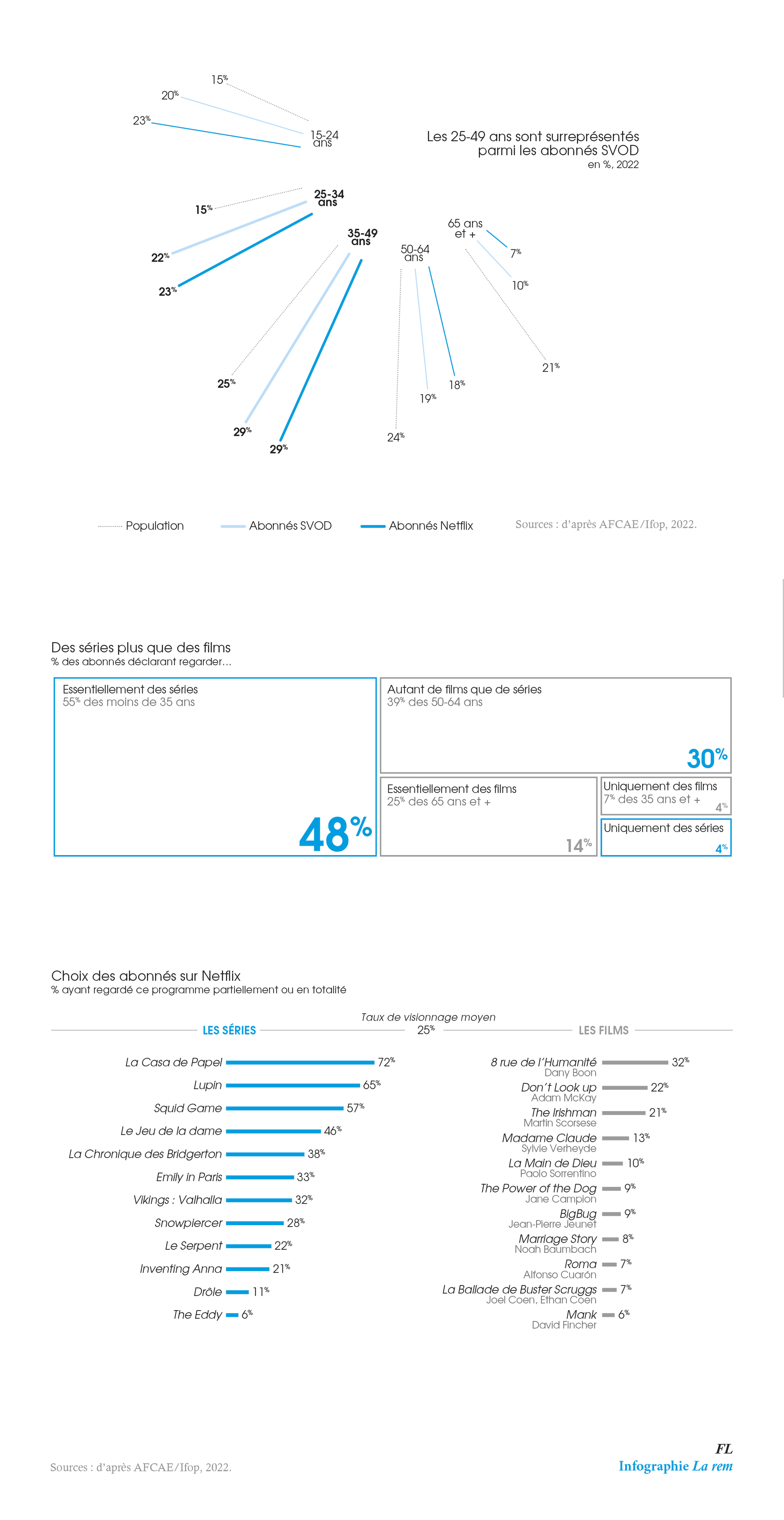 Selon l’enquête de l’Ifop réalisée en ligne entre le 31 mars et le 5 avril 2022, les abonnés à la SVOD se distinguent surtout de l’ensemble de la population par leur âge, les 25-49 ans étant surreprésentés. Dans une moindre mesure, leur catégorie socioprofessionnelle les différencie de la moyenne de la population – avec respectivement 31 % de CSP+ contre 26 % et 33 % de CSP- contre 30 % – mais ce n’est pas le cas concernant leur lieu de résidence – en région parisienne ou en province et à la ville ou à la campagne – pour lequel les proportions sont identiques.
