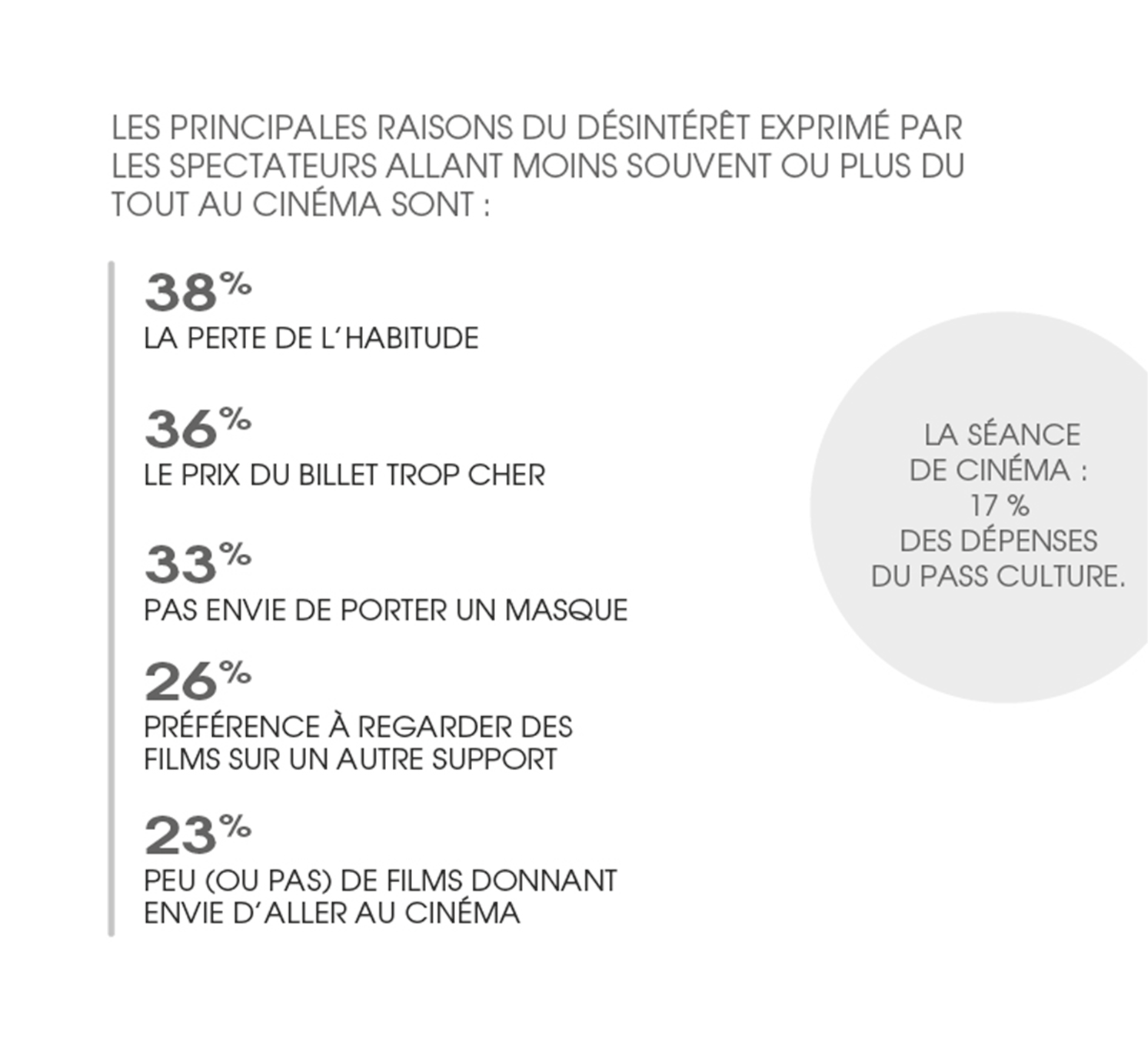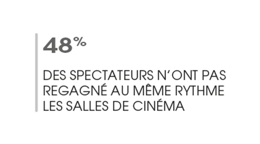 Dans le détail, la perte de l’habitude d’aller au cinéma concerne 53 % des retraités et 51 % des 60 ans et + mais également 41 % des 50-59 ans. S’ajoute une autre catégorie : 42 % des abonnés SVOD (services de vidéo à la demande par abonnement). Les films perdent en visibilité auprès de ces publics qui n’ont plus accès aux bandes-annonces en salle, principale source d’information sur les films à l’affiche pour plus de 50 % des spectateurs.