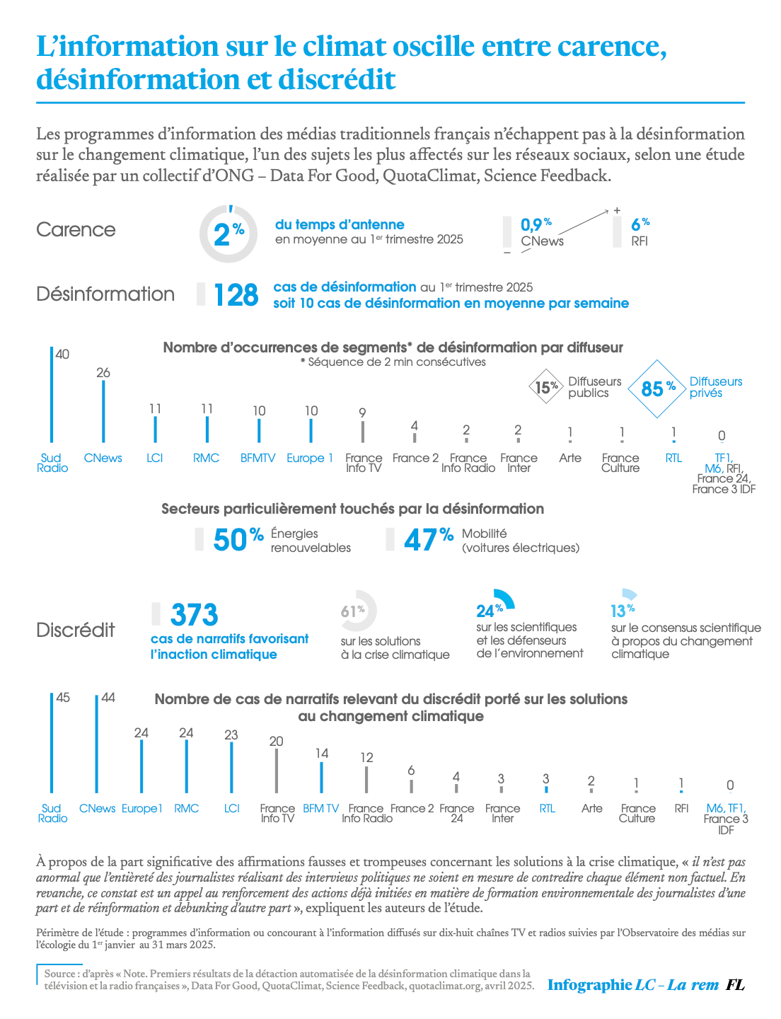 Les programmes dʼinformation des médias traditionnels français nʼéchappent pas à la désinformation sur le changement climatique, l’un des sujets les plus affectés sur les réseaux sociaux, selon une étude réalisée par un collectif dʼONG – Data For Good, QuotaClimat, Science Feedback.