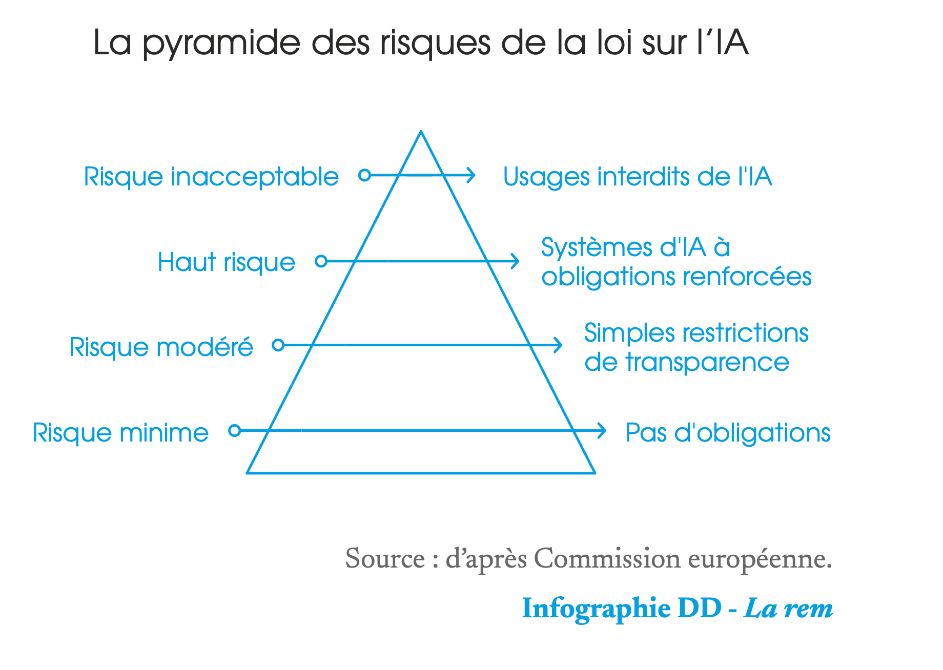 La loi distingue ainsi quatre types d’usages : les usages considérés comme inacceptables et donc interdits comme les systèmes de reconnaissance d’émotions déployés dans l’environnement de travail ou certaines formes de notation sociale7 ; les usages à haut risque (soumis à des obligations renforcées) que sont les systèmes d’IA utilisés dans la gestion d’infrastructures critiques ; les usages à risque modéré (sujets à de faibles restrictions de transparence) et les usages dont les risques sont considérés comme minimes. Les fondements même de cette architecture proposée par la Commission n’ont pas été contestés lors des négociations. L’essentiel des débats au sein du Parlement et du Conseil a résidé dans la définition du contenu et du champ de chacune de ces catégories, présentées régulièrement sous la forme de la pyramide des risques suivante.