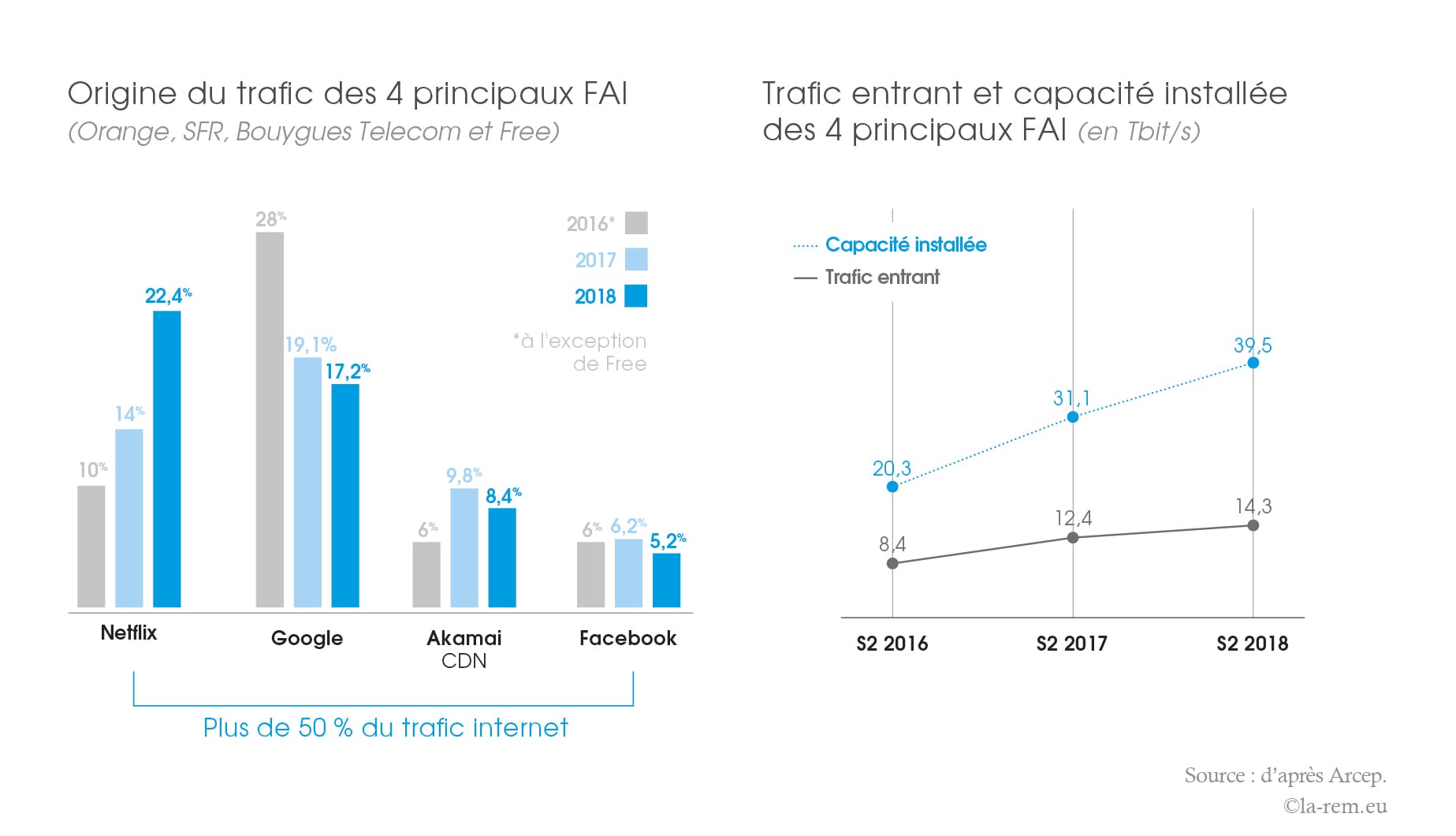 Avec plus de 5 millions d’abonnés en 2018, Netflix est devenu le plus gros fournisseur de contenus générant près d’un quart du trafic vers les clients des principaux fournisseurs d’accès à internet (FAI) en France, Orange, SFR, Bouygues Telecom et Free. Les données collectées par l’Arcep montrent également une concentration du trafic internet entre quatre acteurs sur les trois dernières années : Netflix, Google, Akamai et Facebook accaparent ensemble plus de la moitié de la bande passante. La place prise par le CDN Akamai reflète la forte croissance du volume de données à acheminer sur internet : un CDN (Content Delivery Network) ou RDC en français (réseau de diffusion de contenus) joue en effet un rôle essentiel pour la qualité d’un service internet. Intermédiaire entre le fournisseur de contenus et le fournisseur d’accès à internet, le CDN assure, via un réseau de serveurs, la livraison des flux de données, sans temps mort, vers les internautes. La France est l’un des premiers marchés européens pour Akamai, grâce au développement des services OTT (over the top) et au déploiement du très haut débit. Google et Netflix, quant à eux, déploient des CDN internes au réseau des principaux FAI en France.