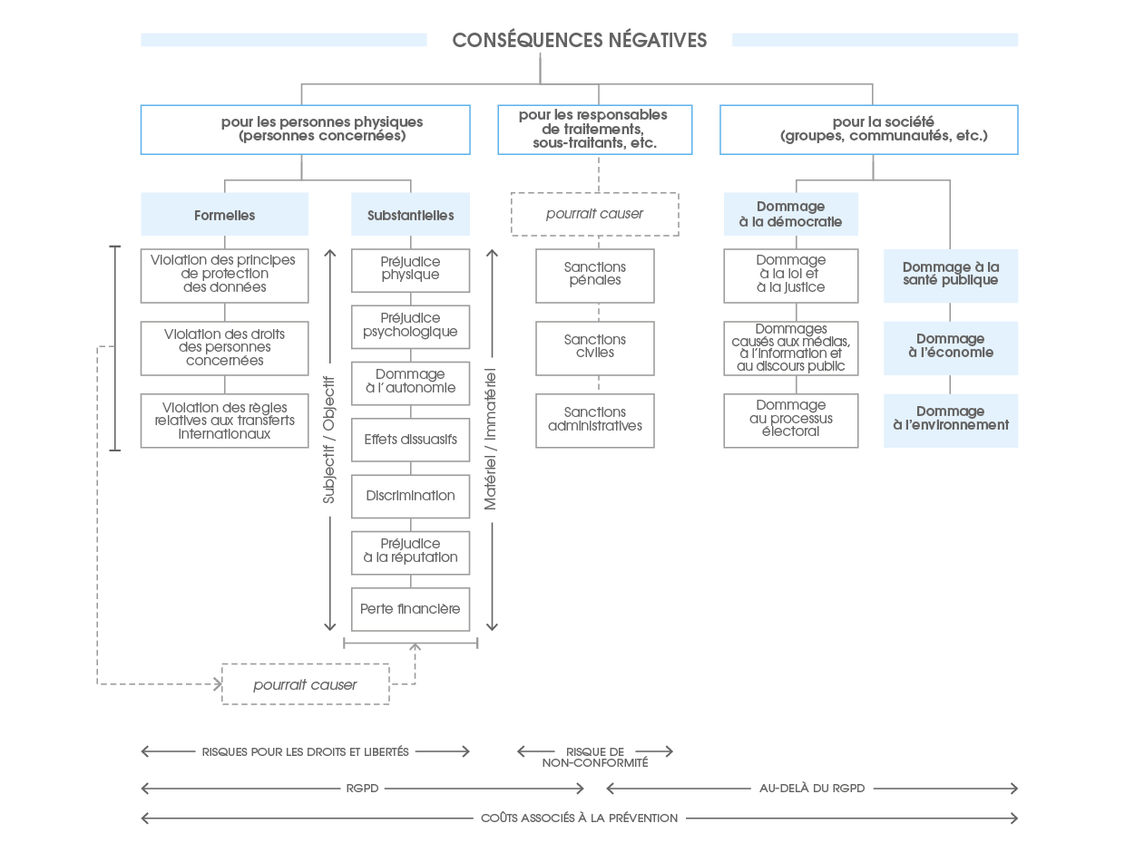 Premièrement, des conséquences négatives peuvent affecter en particulier les personnes physiques : les personnes concernées mais plus largement d’autres personnes. Au sein de cette catégorie, il convient de distinguer les conséquences substantielles des conséquences formelles. Les conséquences substantielles incluent divers effets tels que les pertes financières, la discrimination ou l’atteinte à l’autonomie, notamment par des actes de manipulation ou de coercition. Elles peuvent également se manifester par des effets dissuasifs, des dommages psychologiques comme la détresse émotionnelle ou la perturbation, ainsi que par des atteintes à la réputation, telles que l’embarras, la honte ou le ridicule. Enfin, ces conséquences substantielles peuvent aller jusqu’à engendrer des dommages physiques, incluant des blessures corporelles, voire le décès. Les conséquences formelles, quant à elles, consistent en des violations des dispositions du RGPD sans qu’il y ait nécessairement un préjudice tangible ou intangible pour une personne physique. Elles incluent les infractions aux principes de protection des données, aux droits des personnes concernées ou aux règles relatives aux transferts internationaux.