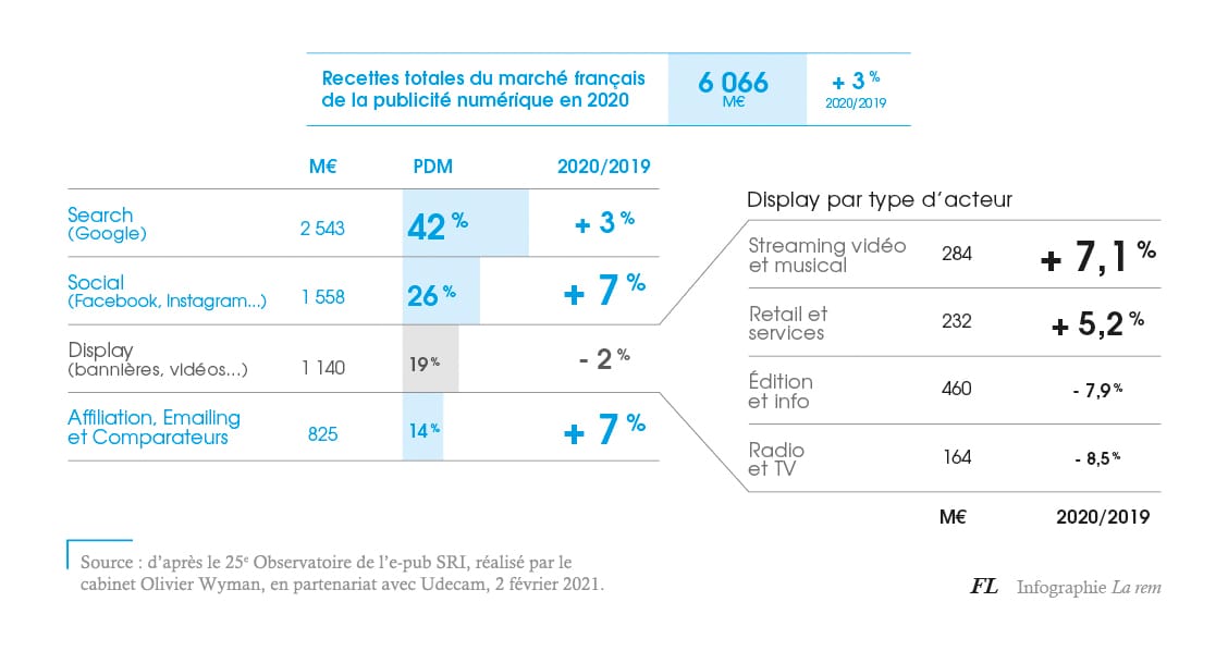 Les années précédentes, entre 2013 et 2019, le secteur avait enregistré un taux de croissance annuel moyen de + 13 %. La performance de la publicité numérique est certes à un seul chiffre pour 2020, mais il est à rapprocher de la chute des recettes publicitaires des grands médias – presse, TV, radio, affichage et cinéma, y compris sur l’internet, estimée à -12,7 %. Le search et le social dominent, avec 78 % de part de marché (hors affiliations, emailing et comparateurs) et la part du programmatique (achats automatisés) atteint 80 % des recettes pour le display et le social en 2020.