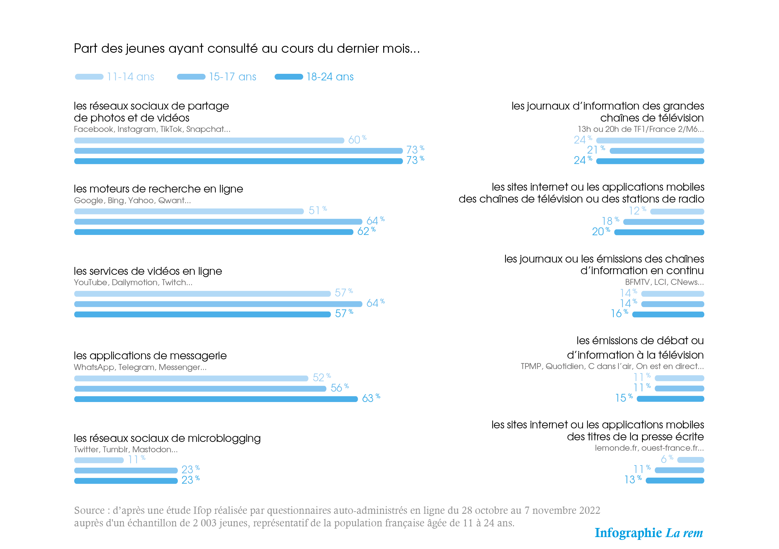 Parmi les Français âgés de 11 à 24 ans, un sur trois (33 %) déclare « avoir confiance » dans la fiabilité des informations sur les questions d’actualité et de société diffusées sur les réseaux sociaux en 2022, contre 21 % qui n’ont « pas du tout confiance » et 46 % qui n’ont « pas vraiment confiance ». Le taux de confiance atteint 45 % chez les jeunes qui utilisent les réseaux sociaux plusieurs fois par jour. Pour 41 % des TikTokeurs, le grand nombre d’abonnés d’un créateur de contenus ou influenceur constitue un gage de fiabilité.