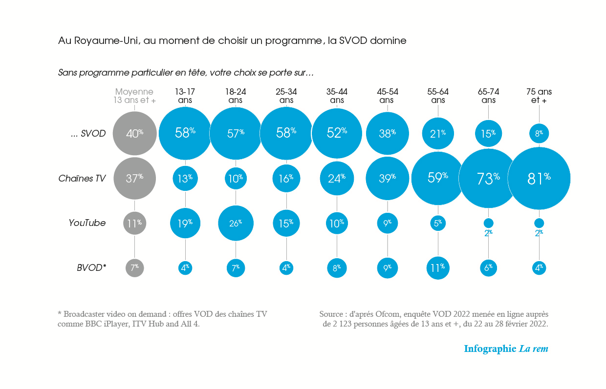 Au premier trimestre 2022, 2 foyers sur 3 sont abonnés à un service au moins de SVOD (67 %, soit 19,2 millions de foyers) : 60 % ont choisi Netflix, 46 % Amazon Prime Video, 23 % Disney+, et 46 % ont souscrit à deux services ou plus, selon l’Ofcom (Office of communications).
