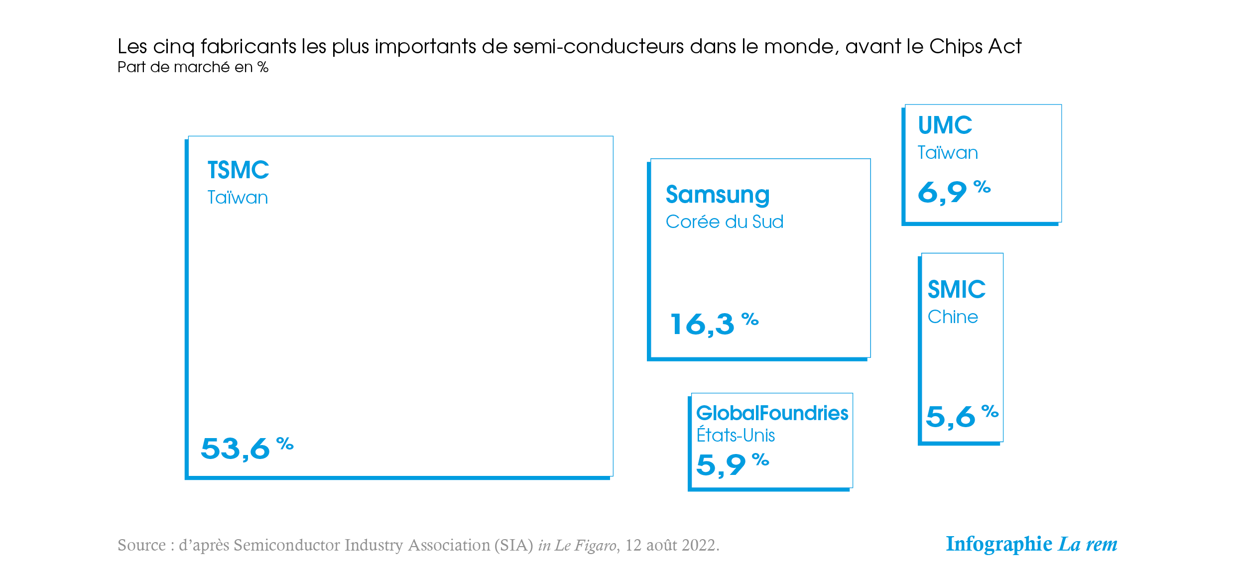Le groupe américain Micron compte investir 15 milliards de dollars dans une usine dans l’Idaho et 20 milliards dans l’État de New York. Intel relance de son côté la construction d’usines avec 20 milliards prévus en Ohio et 20 milliards en Arizona. Mais les États-Unis sont surtout parvenus à attirer les grands fondeurs asiatiques puisque le spécialiste taïwanais de la nanogravure, le groupe TSMC, a annoncé un investissement de 40 milliards de dollars en Arizona. Il accepte de fabriquer aux États-Unis des puces de 4 nanomètres, puis de 3 nanomètres dès 2026, donnant ainsi aux États-Unis un accès aux puces les plus performantes. De son côté, le sud-coréen Samsung, premier producteur mondial de puces, le premier à avoir déclaré en juin 2022 être parvenu à graver des puces de 3 nanomètres, va investir 17 milliards de dollars au Texas. Mais les subventions accordées en lien avec le Chips Act ont une contrepartie : les entreprises qui en bénéficient s’engagent à ne pas investir en Chine pendant au moins dix ans dans la production de puces inférieures à 28 nanomètres d’épaisseur. Autant dire des puces qui ont au moins dix ans de retard sur les avancées technologiques.